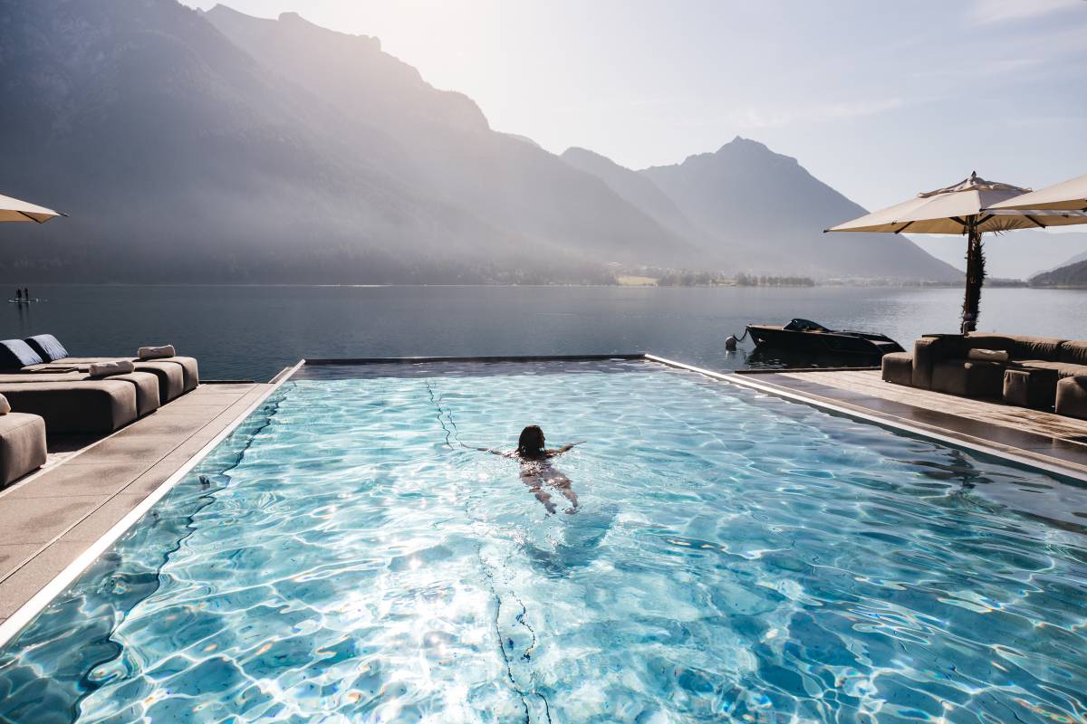 Zuschauen beim Wassersport macht fast ebenso viel Spaß wie Mitmachen, im Entners Hotel am Achensee. Vom Infinity Pool aus oder von der Strandbar – vielleicht mit einem erfrischenden Cocktail in der Hand ...