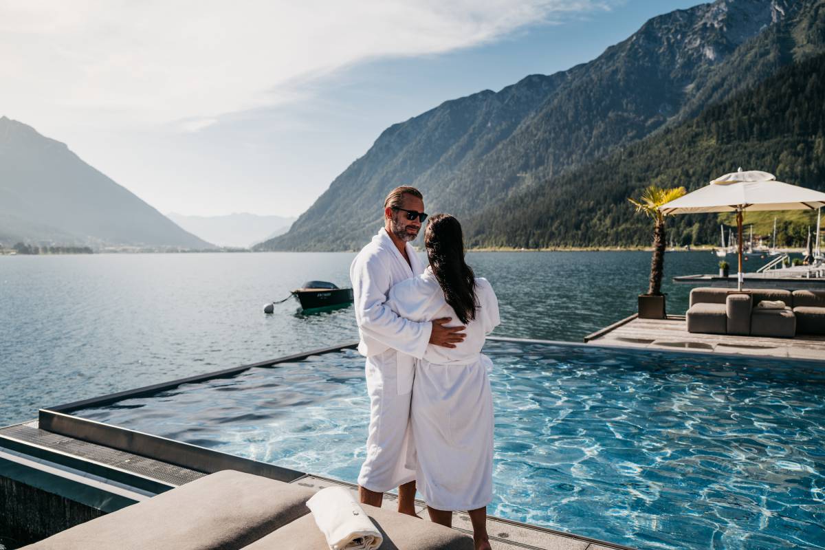 Hier, in unserem Hotel am Achensee mit Pool, können Sie sich nach einem ereignisreichen Tag von der Hektik des Alltags erholen. Verweilen Sie bei einem Buch, einem erfrischenden Drink und kleinem Snack, während Boote vorbeigleiten und sanfte Musik von der Strandbar erklingt. Lassen Sie sich von der Panoramaaussicht verzaubern, die unser Hotel mit Infinity Pool am See zu einem perfekten Rückzugsort macht.