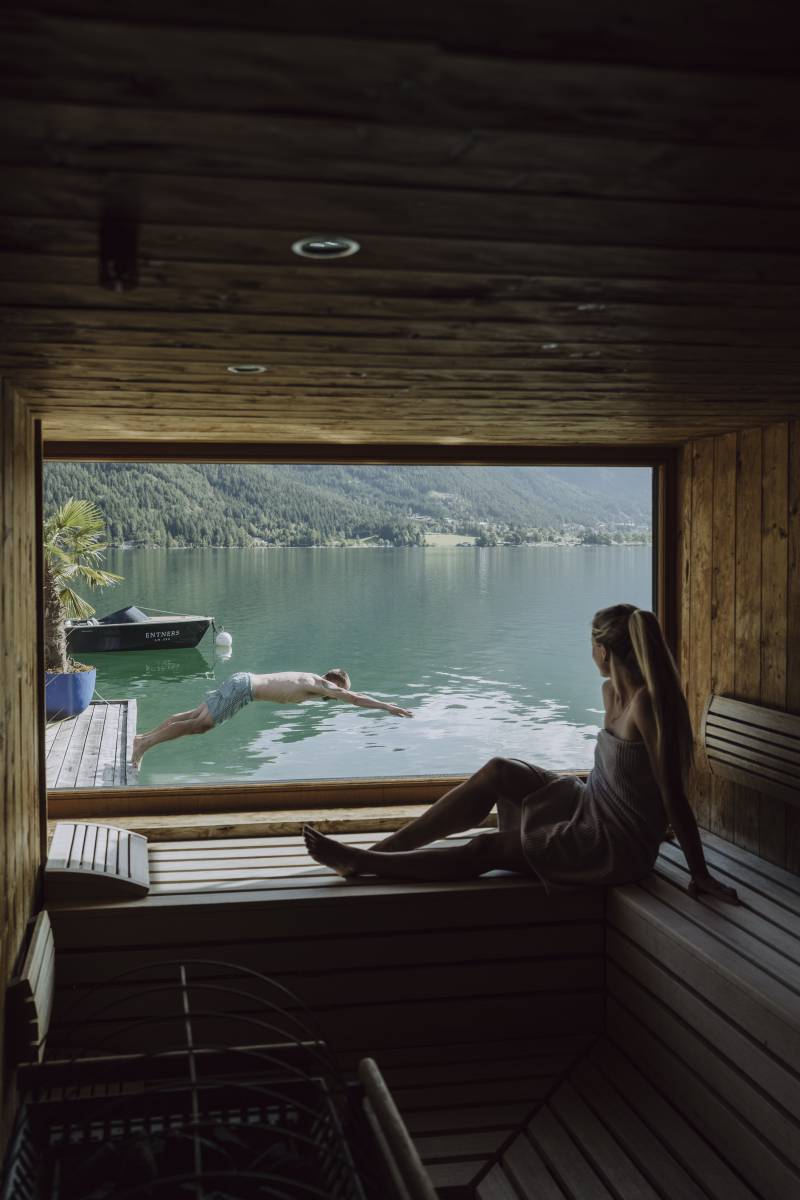 In der See Sauna gleich neben dem Infinity Pool: freie See-Berg-Blicke. Wohlige Wärme, die alle Spannung davonschmelzen lässt. Balsam für Ihre Muskeln nach einer ausgiebigen Bergwanderung oder Bikerunde. Wohltuend für die Seele. Und nach dem Saunagang? Frische Bergluft einatmen. Zur Abkühlung in den kristallklaren Achensee springen. Eine ganzheitliche Erfrischung, die Sie bis in die Haarspitzen energetisiert.