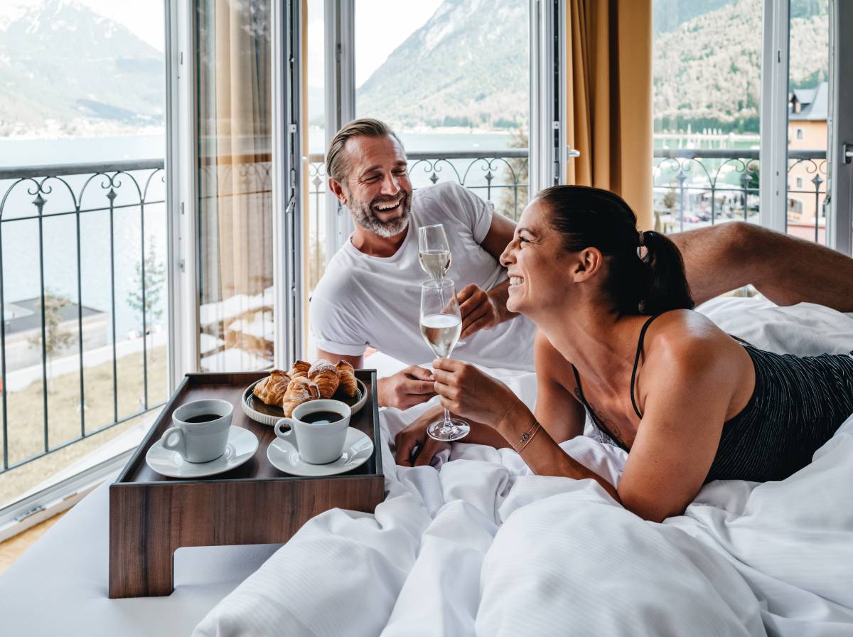 Whether at the Infinity pool in the Lake, the beach bar with alpine-Mediterranean Dolce Vita, cozy beds with heavenly lake views, or the dining rooms with Tyrolean charm: Discover your favorite places at Entners here online. Or even better: directly at the Hotel.
